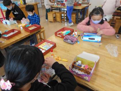「ここはお風呂なんだー」「ふかふかのベッドができたよ」「わたしは三階建ての家!」と、それぞれがアイディアを広げて、小さな友達のための家をつくっていました。