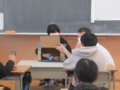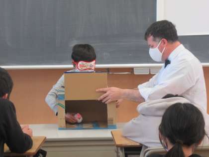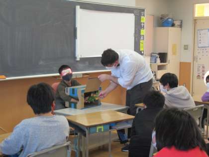 3月11日(木)、今日の外国語活動は、ALTとの最後の授業でした。1年のまとめをゲームや歌を通して楽しくふり返ることができました。特に、Wht's this?ボックスのゲームでは、目隠しをして箱の中身を当て、英語を使って聞いたり答えたりしながら、みんなで盛り上がりました。