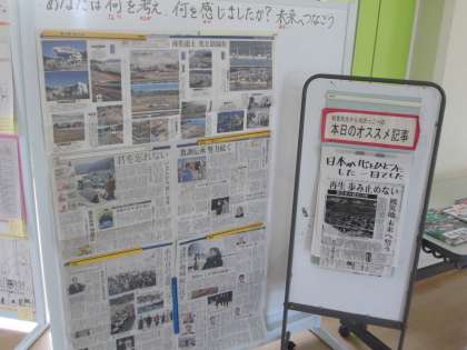 登校した子が今朝の新聞記事に目を奪われていたり震災関連の本を開いたりしている姿から、子供たちなりに何かを感じ何かを考えた昨日だったことが分かります。