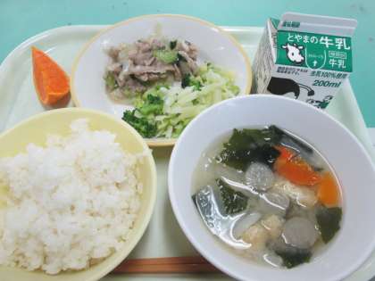 今日の献立は、ごはん、牛乳、豚肉の塩こうじ炒め、そえ野菜、五目みそ汁、せとか です。
