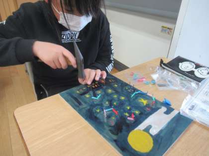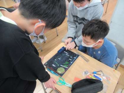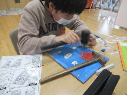 3月16日(火)、図画工作科ではくぎうちとんとんをしています。玉を、釘を打って作った囲いのところに飛ばし遊ぶゲーム作りですが、子供たちはどうやったら玉がいろいろなところに飛ぶか、また、障害物を作ればよりおもしろくなるのではないかなどと試行錯誤しながら作っています。友達のよいアイディアを聞いて、自分に取り入れている子供もいました。出来上がって、みんなでゲームをするのが楽しみですね。