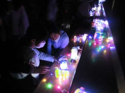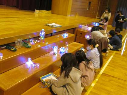 3月17日(水)、図画工作科の学習で作った「クリスタルアニマル」の鑑賞会をしました。カウントダウンをして明かりを消すと、色とりどりに光るみんなの作品に子供たちからは大きな歓声があがりました。思い思いに作品をながめながら友達の作品の素敵なところを見付け、楽しい鑑賞会になりましたね。