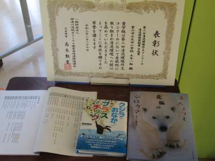 右は、5年生がイタイイタイ病の学習を通して書いた作文に対して受賞した学級賞と、その副賞の図書カードで購入した環境に関する本です。この本は、図書室に寄贈され4月から読むことができます。
