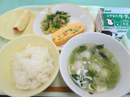 今日の献立は、ごはん、牛乳、千草焼き、アスパラのごまだれ、つみれ汁、りんご です。