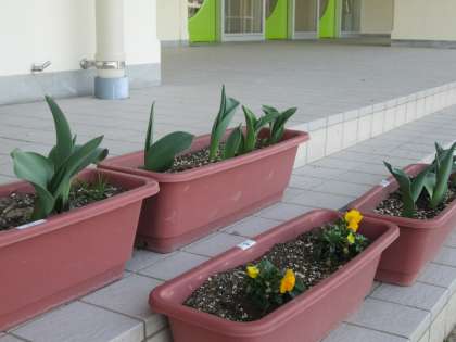 玄関のチューリップが力強く伸び、正面の桜もふくらみ始めました。