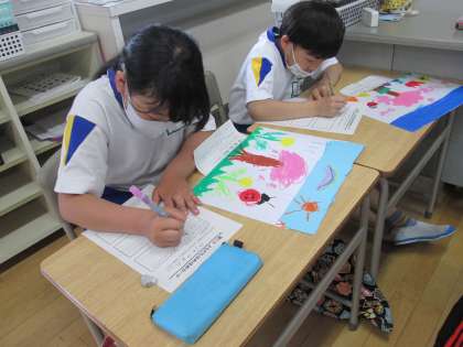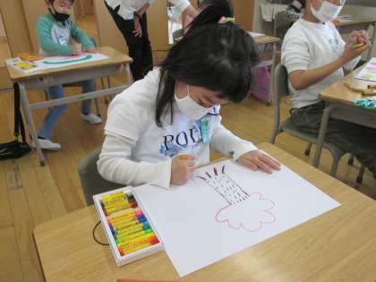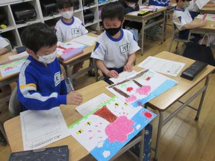 4月28日(水)、図画工作の授業でかいた「おはなみスケッチ」の鑑賞会をしました。友達の作品の素敵なところを見付けて、紹介し合いました。同じものをかいていても人によって表し方がちがうことを感じ、楽しみながら鑑賞していました。