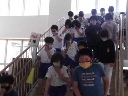 給食室で火災が起きたという想定の下、今年度初めて全校が一斉に避難する訓練を行いました。コロナ感染対策のため、なかなか全校での活動は行えませんが、命に関わる指導はしっかりと行っていきます。