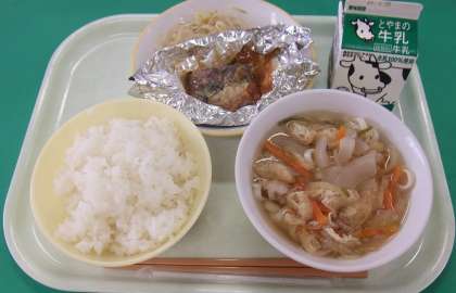 本日の献立は、ごはん、かしわうどん、さばの銀紙焼き、甘酢和え です。