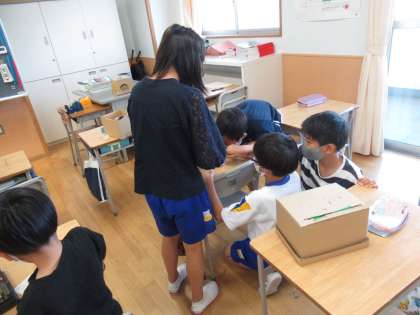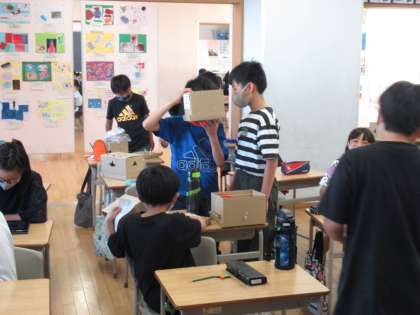 図工「のぞいてみると」作品紹介5年生 公開日 2021/05/28 更新日 2021/05/28 5年生 「のぞいてみると」の作品を紹介し合いました。お互いの作品の穴をのぞき、友達の箱の中の光の世界を楽しみました。