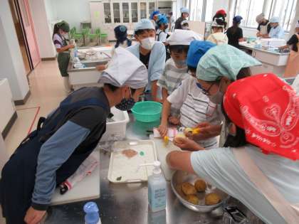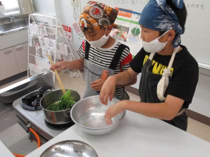 ゆでる調理として、「ほうれんそうのおひたし」と「ゆでいも」の調理をしました。初めて包丁を使った調理でしたが、手際よく作業することができました。ほうれんそうとじゃがいものゆで時間の違いや加熱した後の色やかさにも注目して調理しました。みんなでおいしくいただきました。