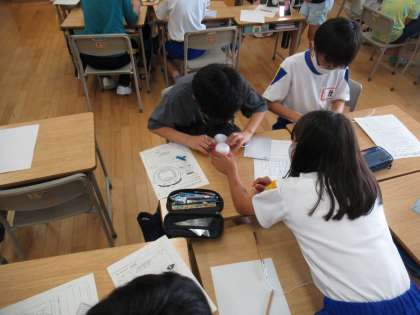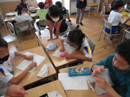 養護教諭と歯肉炎を予防するための歯磨きの仕方について学習しました。手作り模型を使ってデンタルフロスのよさを体感し、歯と歯の間まできれいにすることが大切だと分かりました。