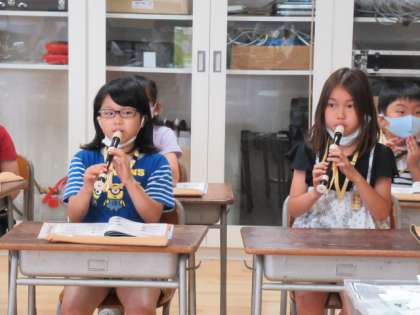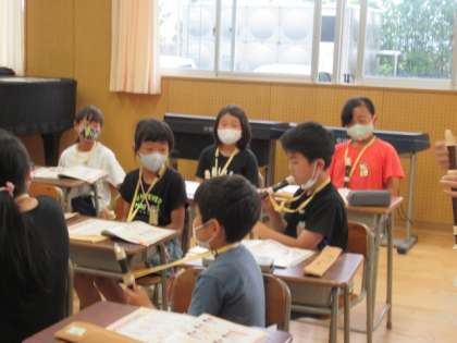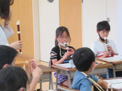 6月14日(月)、音楽科ではリコーダーの学習をしています。子供たちは、自分の新しい楽器で、音を出すことが嬉しいようです。この日は、覚えたばかりのシの音のタンギングを上手にできるようにみんなで聞き合いました。