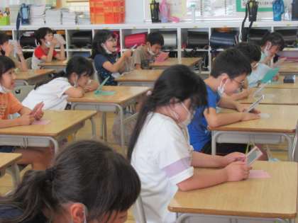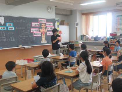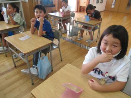 6月15日(火)、養護教諭と歯を大切さについて学習しました。自分の口の中を鏡で見て、犬歯、前歯、奥歯の形の違いや役割について教えてもらいました。また、スルメをよく噛むと、唾液が出てくることや奥歯をよく使っていることなども感じました。よく噛んで食べることで、よいことがたくさんあると知った子供たちは、そのあとの給食でいつもよりよく噛み、噛むことができる丈夫な歯にしようと丁寧に歯を磨いていました。