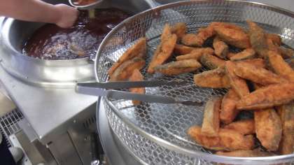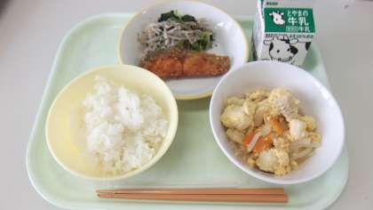 7月2日(金)の給食 公開日 2021/07/02 更新日 2021/07/02 給食室 本日の献立は、ごはん、魚の竜田揚げ、ゆかり和え、親子煮、牛乳 です。 今日の魚は鮭でした。香ばしく揚がってとても美味しかったです。