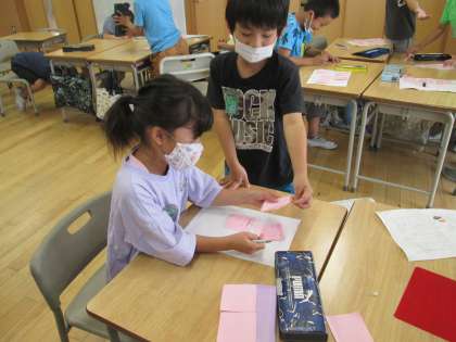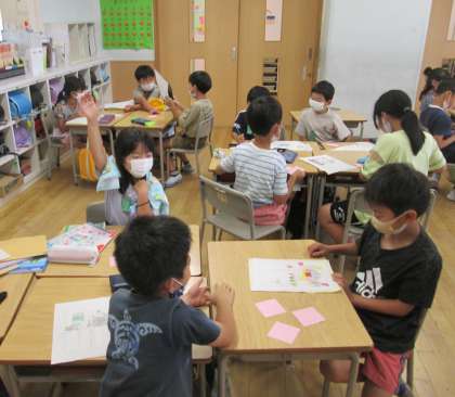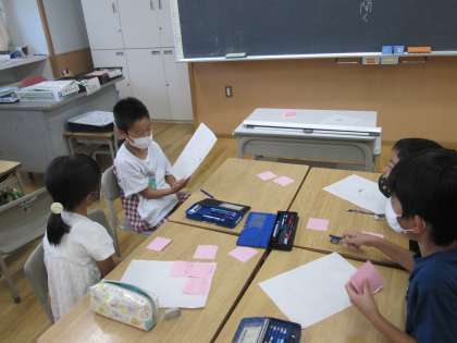 先週から、国語の学習で「今はないけれど、あったらいいなと思うもの」を考えてきました。今日はグループで発表会を行い、「押した日のメニューが出てくる献立表」や、「食べるとテストで100点が取れるりんご」等、一人一人の願いが詰まったアイディアに「いいね!」「ほしい!」と大盛り上がりでした。発表後は付箋を使って、友達に感想を伝えることができました。