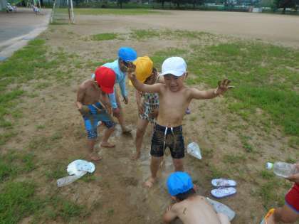 7月16日(金)1・2時間目、生活科「あつくなったよ」の学習で、水鉄砲と砂で遊びました。