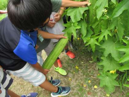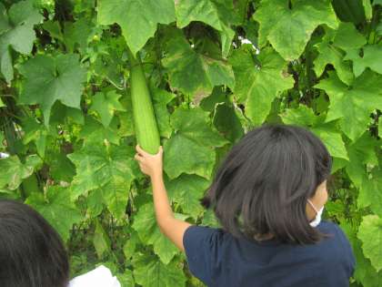 8月30日(月)、理科の学習でへチマの観察をしました。1ヵ月ぶりに観察するへチマは、子供たちの身長の半分ほどまで成長しており、子供たちは長さや重さに驚いていました。今後も観察を続けていきます。