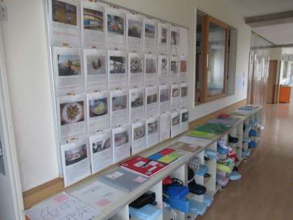 夏休みの課題として取り組んでいた写真日記と自由研究を掲示して作品展を行っています。それぞれが興味、関心をもっていることについて、丁寧にまとめることができています。休み時間には、お互いの作品を見合って思いを伝えている様子も見られました。