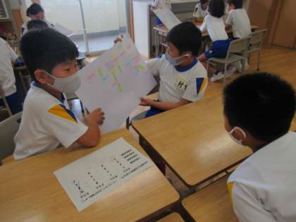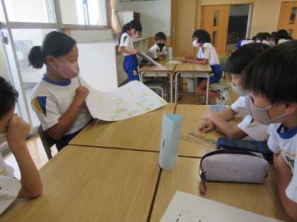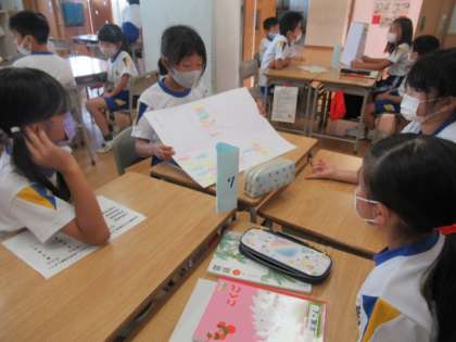 9月7日(火)、「山小屋で三日間すごすなら」の学習はいよいよ終盤を迎えました。前時では、「自然とふれあうために」という目的に合った持ち物を各班で決め、それぞれ理由もみんなで考えました。今日はワールドカフェ形式で発表をし、全員が他の班の友達に自分の班の決めたことを発表することができました。