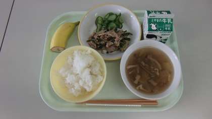 9月10日〈金)の給食 公開日 2021/09/10 更新日 2021/09/10 給食室 今日の献立は、ごはん、豚肉のキムチ炒め、きゅうりもみ、茎わかめスープ、バナナ、牛乳です。 豚肉のキムチ炒めは、辛みは少なく、キムチのうま味が出ていて美味しかったです。