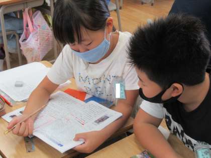 9月14日(火)、社会科で「郷土の発展」についての学習が始まりました。今日の学習では、黒部市の十二貫野台地の今と昔の2枚の地図を見比べて、変化したところを見付けました。資料を真剣に見て、友達と関わり合いながら学習を進めていました。