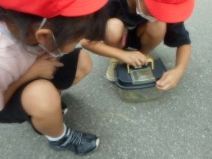 虫が逃げないように、蓋をしっかりと押さえながら、必要なものを入れている子供の姿が見られました。