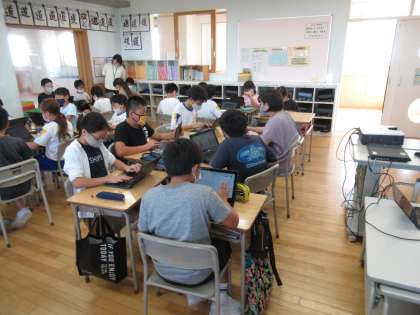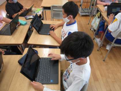 今月の終わりから来月はじめにかけて、いよいよ稲刈りをする予定です。今日は、稲刈りをした後のもち米の販売について、「商品化」「宣伝」などについてみんなで、クロームブックを活用してアイディアを出し合いました。