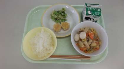 9月17日(金) 公開日 2021/09/17 更新日 2021/09/17 給食室 本日の献立は、ごはん、人参シューマイ、八宝菜、小松菜ひたし、牛乳 です。 八宝菜には、10種の具材が入っています。具だくさんですね。玉ねぎやヤングコーンなどちょうどよい歯ごたえがあり好評でした。