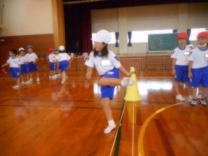 9月22日(水)3時間目、今まで遊んだ「はばとびあそび」「けんけんぱあそび」「ゴムとびあそび」の用具を、体育館いっぱいに並べ、体育科「ジャンプワールド」の学習をしました。
