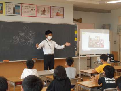9月24日(金)、約一ヶ月間の教育実習が終わりました。最後の授業に、実習生の先生の経験をもとに、テーブルマナーや世界の食事について特別授業をしてもらいました。子供たちは興味津々な様子で聞いていました。一ヶ月間、ありがとうございました!