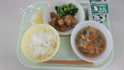 本日の献立は、ごはん、魚とひよこ豆の甘からめ、ゆでブロッコリー、すまし汁、冷凍りんご、牛乳です。