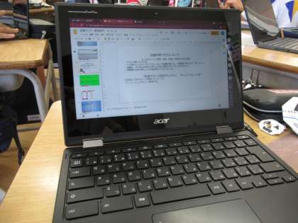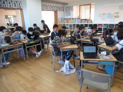 育ててきたもち米を収穫し、いよいよ販売に向けて「商品化部門」「宣伝部門」「店舗づくり・販売部門」に分かれて話合いを始めました。クロームブックを活用し、互いの意見や考えたアイディアを出し合っています。