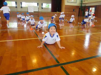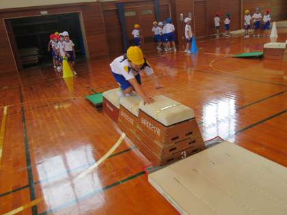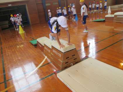 体育では、跳び箱遊びをしてきました。「ドン」と踏み切ること、「ピタッ」と着地することを意識しながら様々な跳び方を楽しみました。