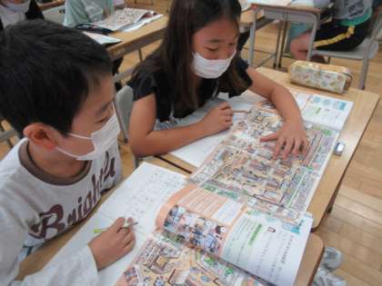 10月13日(水)、社会科では「店ではらく人」の学習をしています。お客さんがどんな願いをもってスーパーマーケットに行っているのかを考え、その願いをかなえる店の工夫について友達と一緒に考えました。