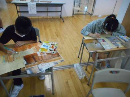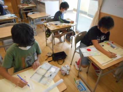 10月14日(木)、図工の時間に描いてきた校舎の絵の色塗りが進んでいます。大きな作品ですが、細かい所まで丁寧に塗ろうとしていました。完成が楽しみです。