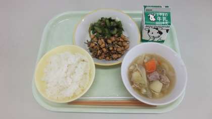 本日の献立は、ごはん、小魚いりフライビーンズ、海藻サラダ、ポトフ、牛乳 です。