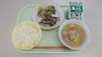 本日の献立は、ごはん、こあじのから揚げ、ごま和え、さつま汁 です。