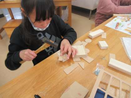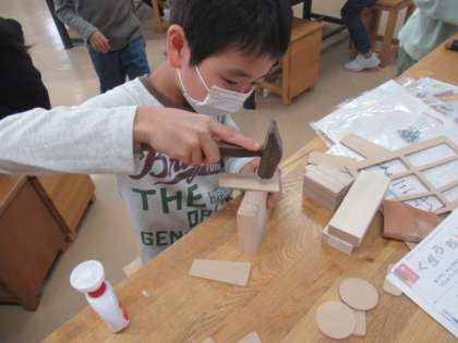 11月2日(火)、図画工作科では「くぎうちトントン」の学習をしました。初めて金づちを使って釘を打つ子供たちも何人かいましたが、みんなで正しい使い方を確認して安全に活動することができました。どんな作品が仕上がるか楽しみですね。