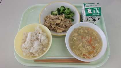 本日の献立は、スタミナレバー丼(麦ごはん)、ゆでブロッコリー、中華かきたまスープ、牛乳 です。