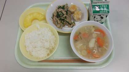 本日の献立は、ごはん、人参シューマイ、スタミナ納豆、具だくさん汁、カットパイン、牛乳 です。