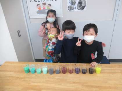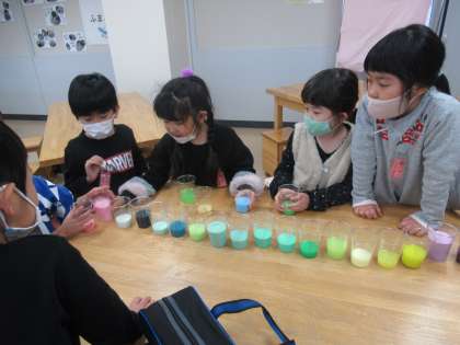 色水を楽しみながらつくった子供たち。次は、どんな風に並べると楽しくなるかを考えながら、並べていました。