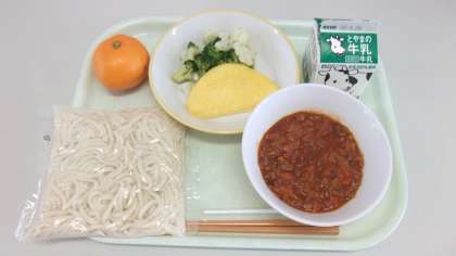 本日の給食は、ソフト麺のミートソースかけ、オムレツ、花野菜のサラダ、牛乳 です。