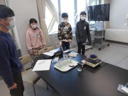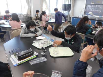 2月3日(木)、理科の時間に水溶液の性質について学習しています。今回は塩酸に金属を溶かす性質があるかどうか、溶けた金属は取り出せるのか実験しました。変化を見付けて、班で記録しました。