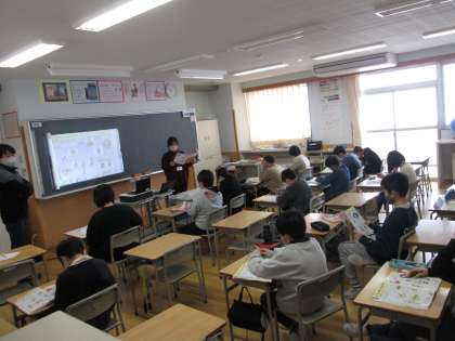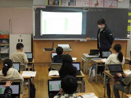 クロムブックを活用して、オンラインの学習を進めています。2年生では国語、3年生は学活と外国語、5年生は外国語、6年生は理科の学習をオンラインでつなぎ、学びを止めないよう支援しています。
