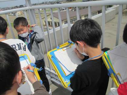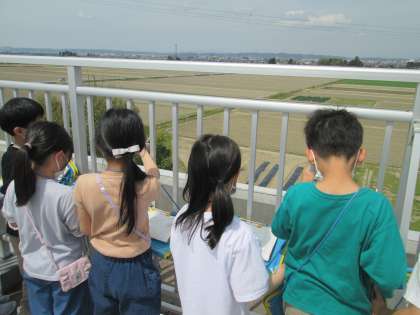 4月13日(水)、社会科の学習がスタートしました。今日は、屋上から学校の周りの様子を観察しました。昨年度も生活科の町探検の学習で屋上に行きましたが、社会科では「東西南北」を意識して、より詳しく観察することができました。これからの学習が楽しみですね。