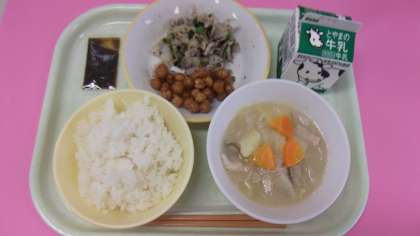 本日の献立は、ごはん、ひよこ豆のフライビーンズ、ゆかり和え、豚汁、のり佃煮、牛乳 です。