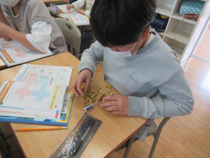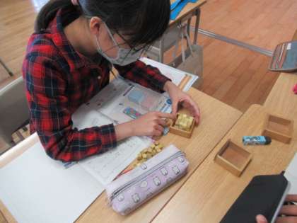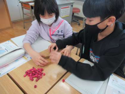 4月20日(水)、算数では「直方体と立方体の体積」の学習が始まりました。今日は4年生のときに学習した直方体と立方体のかさの大きさを比べるために、1cm³の積み木を使って、その積み木が何個分なのか調べ、大きさを比べました。