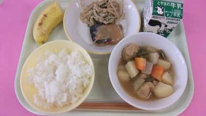 4月21日(金)の給食 公開日 2022/04/22 更新日 2022/04/22 給食室 本日の献立は、ごはん、さばの味噌煮、ごま酢和え、関東炊き、バナナ、牛乳 です。 関東炊きは鰹節でだしをとります。だしがきいてホクホクで美味しかったです。 ミニサイズのがんもどきにもしっかり味が染みていました。