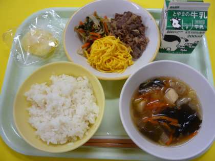 今日の献立は、ビビンバ(焼き肉・ナムル・錦糸卵)、中華スープ、冷凍りんご、牛乳 です。