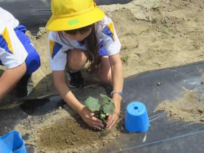 5月12日(木)、野菜の苗を買いに行った後、さっそく学校の畑に植え付けをしました。野菜名人の地域の橋本さんにも協力していただきました。おいしい野菜ができるように、お世話を頑張っていきましょう。